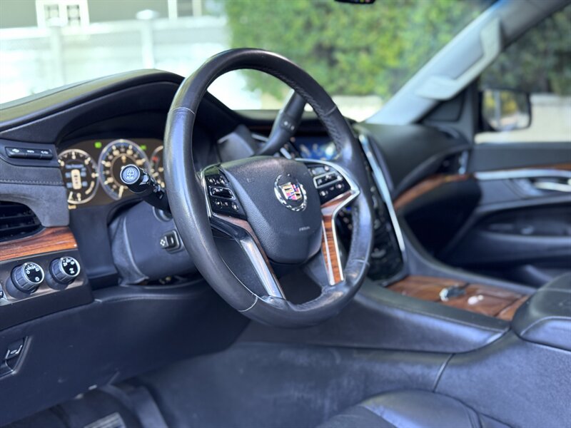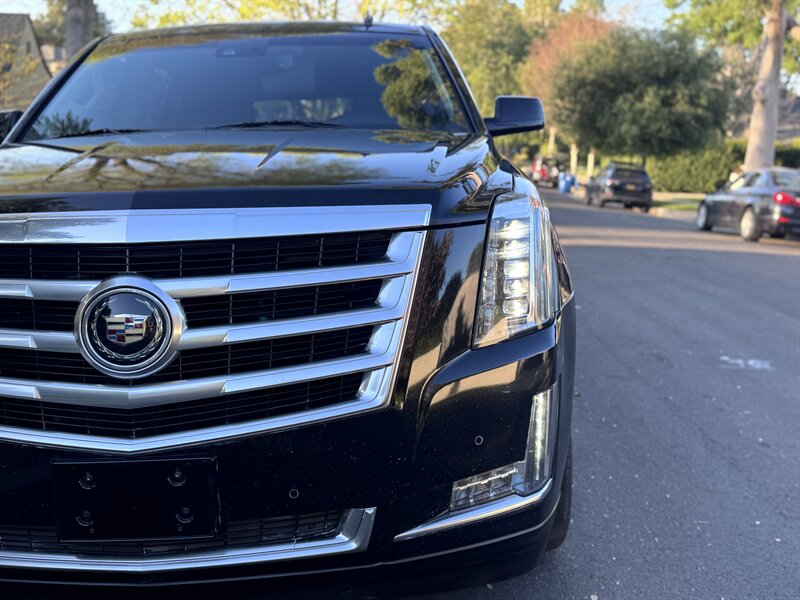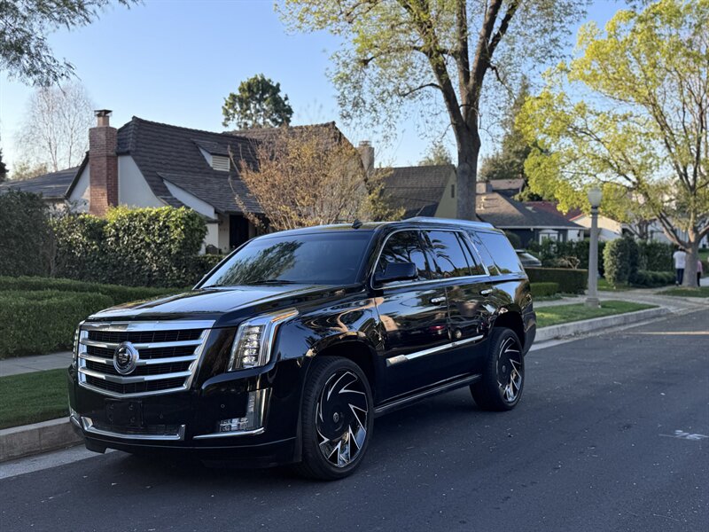 2015 Cadillac Escalade Premium — Black Raven exterior, Jet Black interior. Powered by the EcoTec3 6.2L V8 delivering 420 hp and 460 lb-ft of torque, this Escalade pairs strong V8 performance with a 6-speed automatic transmission and conventional fuel-economy figures of 14 MPG city and 21 MPG highway. The vehicle is in excellent overall condition.