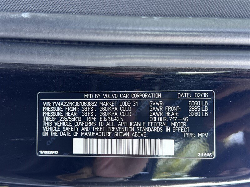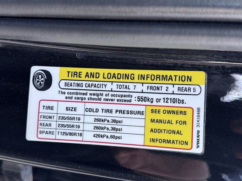 Factory-standard equipment includes seating for seven with leather-trimmed seats and power-adjustable front seats with driver memory, Volvo Sensus infotainment with central touchscreen, Bluetooth and USB connectivity, premium audio, automatic climate control, keyless entry/ignition and a power liftgate. Volvo’s comprehensive safety suite was factory-installed, including City Safety automatic emergency braking, multiple airbags, ABS, stability and traction control, rearview camera, and active aids such as lane-departure warning and blind-spot monitoring.