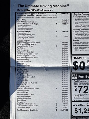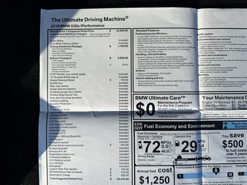Equipped with a host of premium factory features, the 530e iPerformance includes a state-of-the-art navigation system, a high-resolution display, and advanced driver assistance technologies such as adaptive cruise control and lane departure warning. Enjoy the convenience of keyless entry, a premium sound system, and luxurious leather upholstery, all designed to enhance your comfort and connectivity on the road.