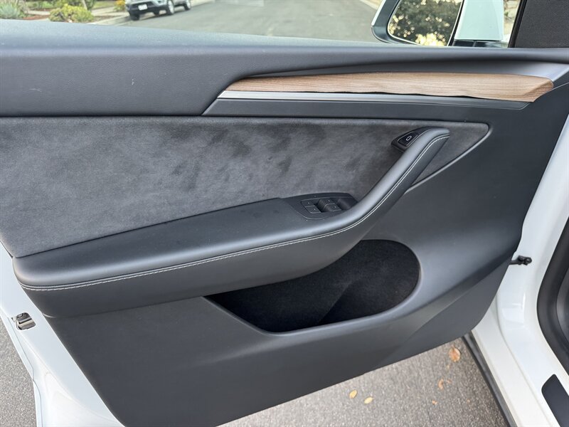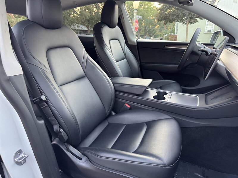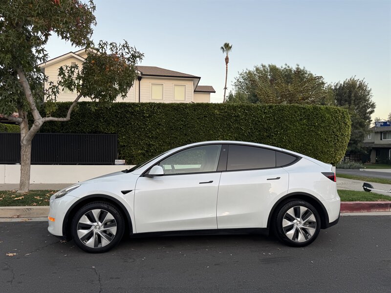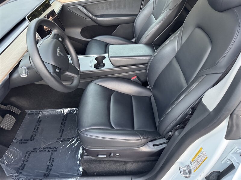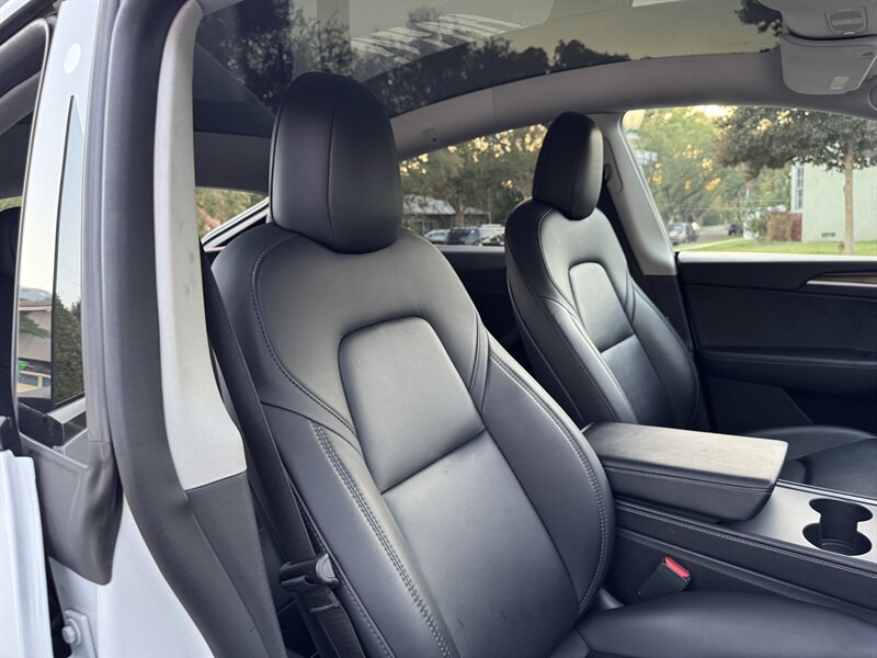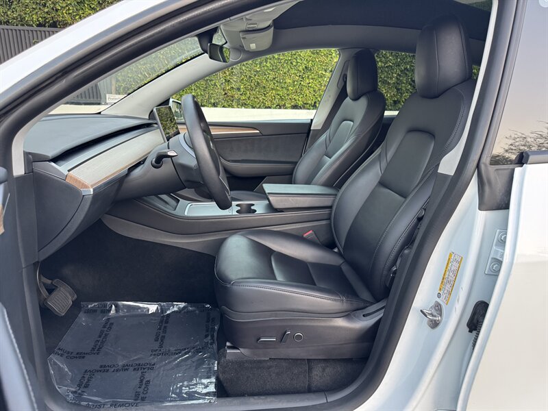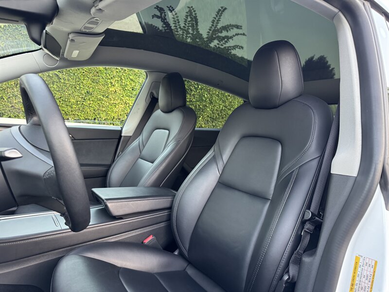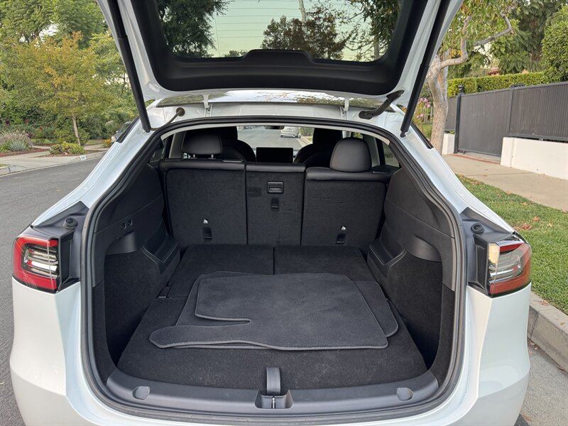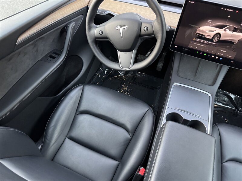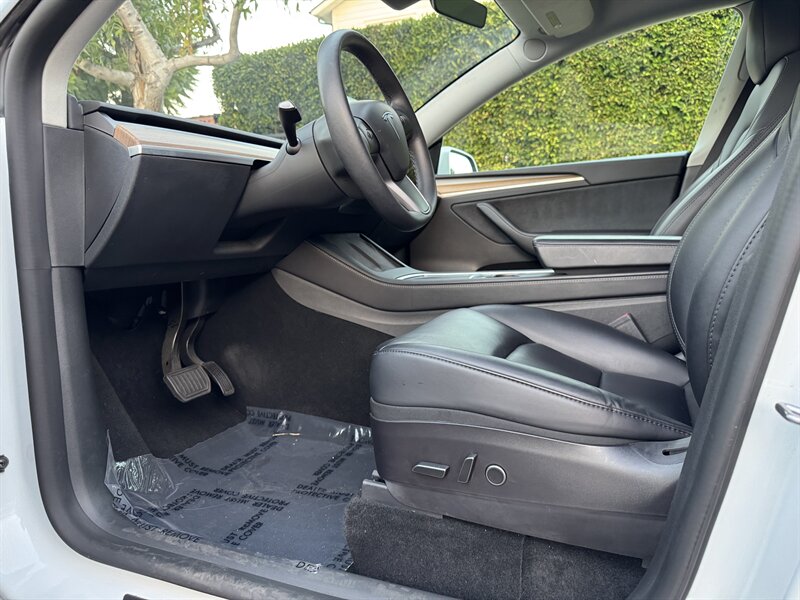 The exterior of this Model Y is finished in a sophisticated Pearl White Multi-Coat, which not only enhances its sleek and modern silhouette but also provides a durable and stunning finish. The aerodynamic design contributes to improved efficiency, making it an ideal choice for both urban and highway driving.