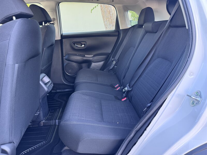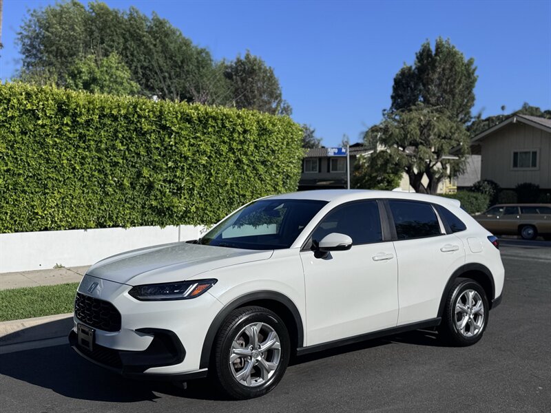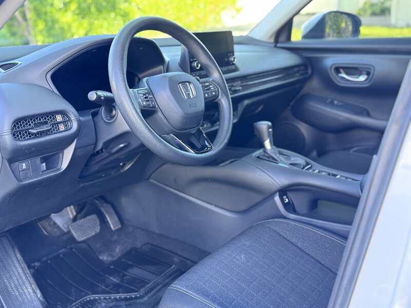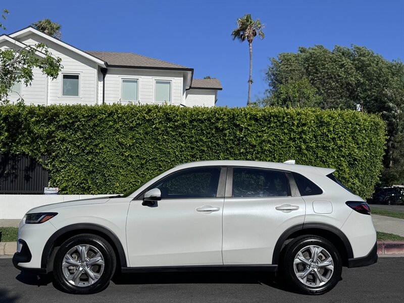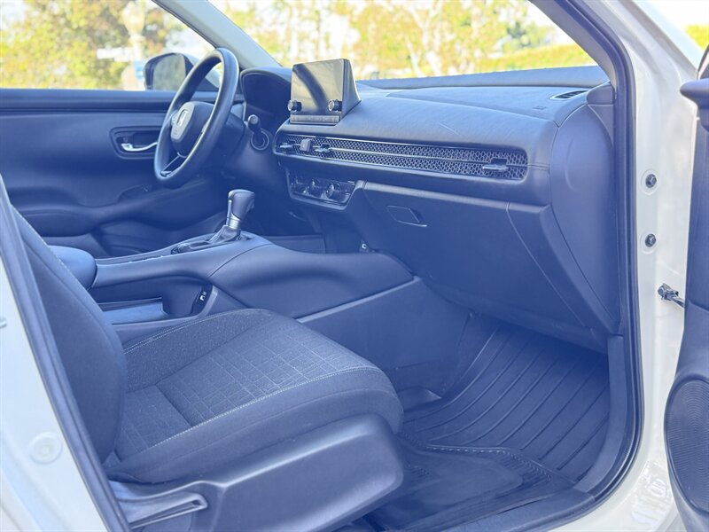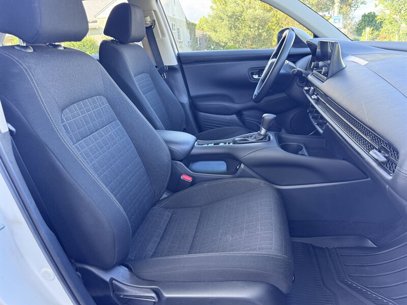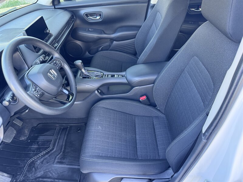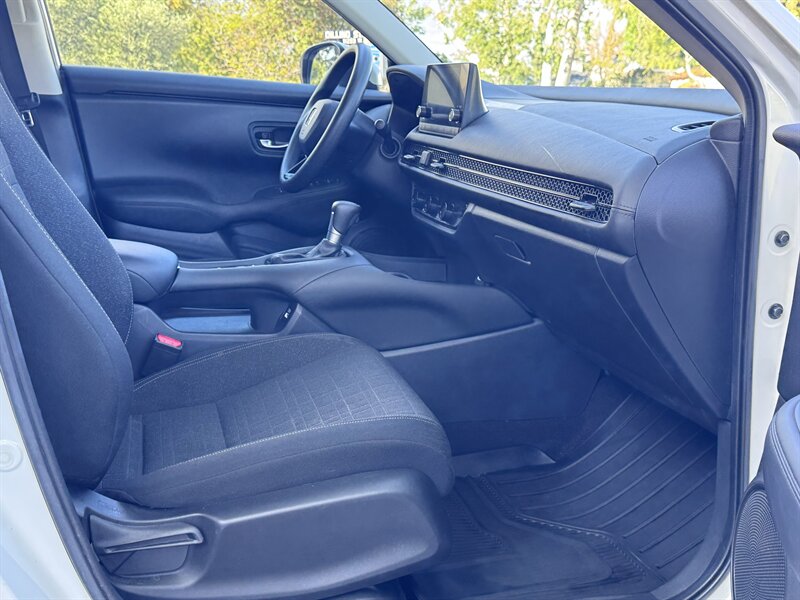 2023 Honda HR-V LX in Platinum White Pearl with a Black cloth interior, powered by a 2.0L I4 producing 158 hp and 138 ft-lbs, EPA-rated at 25 MPG city / 30 MPG highway. Factory-standard equipment includes Honda Sensing safety and driver-assist technologies (Collision Mitigation Braking, Lane Keeping Assist, Road Departure Mitigation, Adaptive Cruise Control), a rearview camera, ABS with stability and traction control, full front and side airbags, and a 7-inch infotainment display with Apple CarPlay/Android Auto, Bluetooth and USB connectivity. Additional standard comforts are cloth seats, manual climate control, power windows and locks, remote keyless entry, cruise control, and a split-folding rear seat for added cargo versatility. This vehicle is in excellent overall condition.