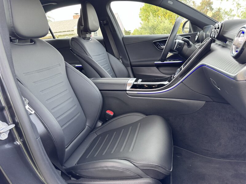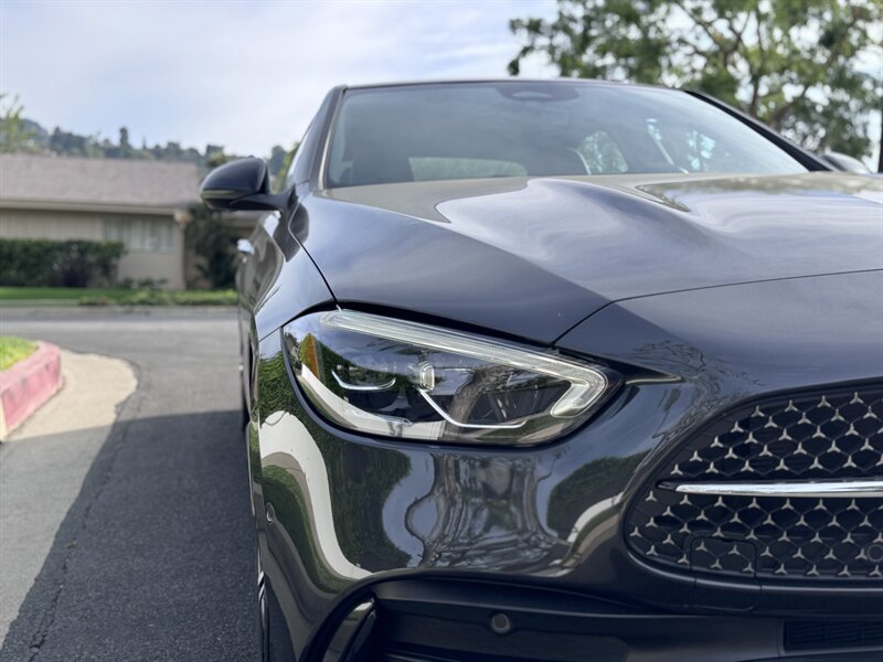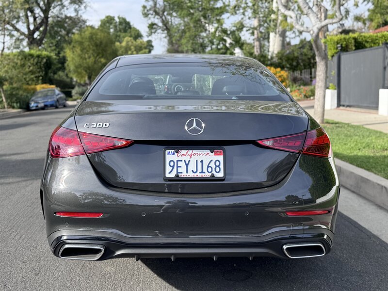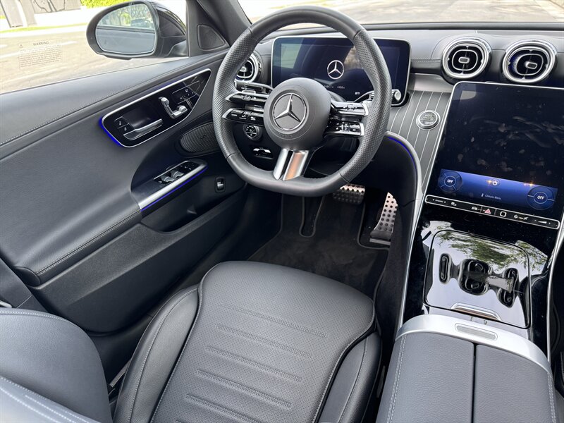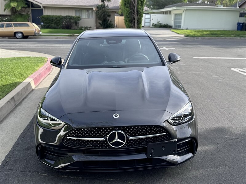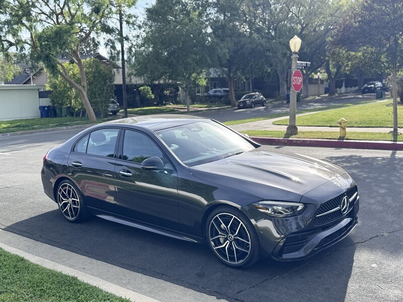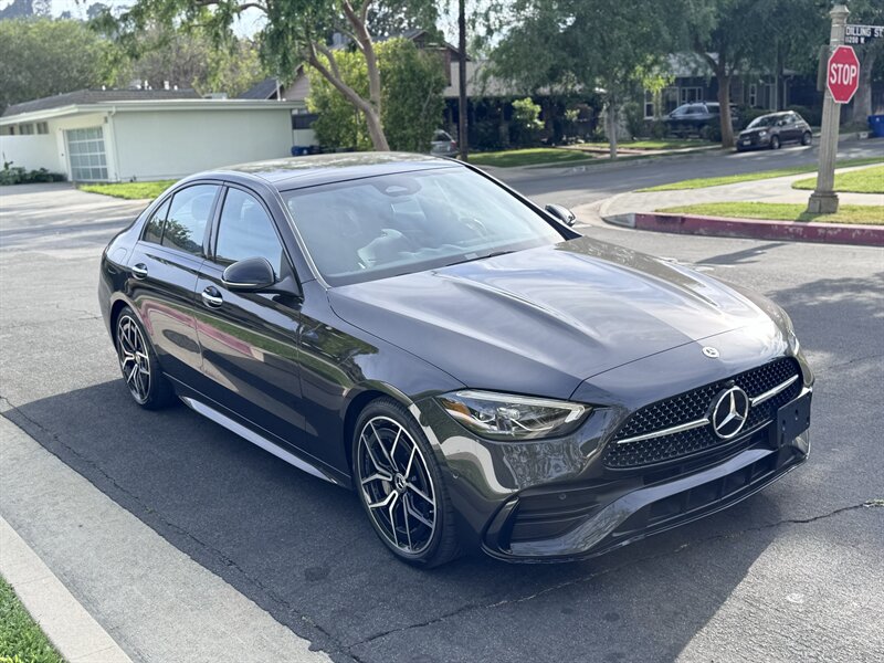 2023 Mercedes-Benz C 300 in Graphite Grey Metallic with a Black interior, powered by a 2.0L mild-hybrid e-turbo I4 producing 255 hp and 295 lb-ft. Factory-standard features include MBUX infotainment with dual high-resolution displays and natural-language voice control, wireless Apple CarPlay/Android Auto, navigation, Bluetooth and USB-C connectivity, dual-zone automatic climate control, power-adjustable front seats, ambient interior lighting, keyless start, LED headlamps/taillights, power trunk and a premium audio system. Comprehensive safety and driver-assist features come standard, including automatic emergency braking, lane-keeping assist, blind-spot monitoring, rearview camera and attention assist. Vehicle is in excellent overall condition with under 5,000 miles (averaging <2,000 miles/year) and EPA ratings of 25 MPG city / 36 MPG highway.