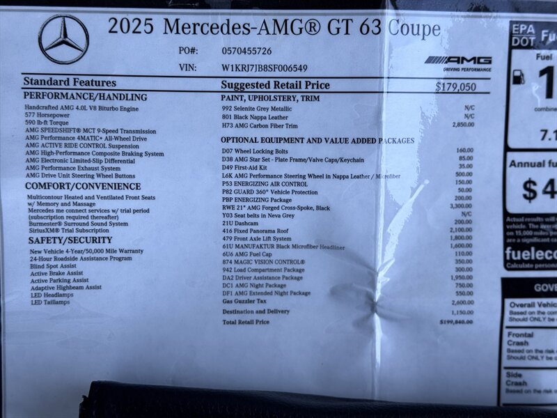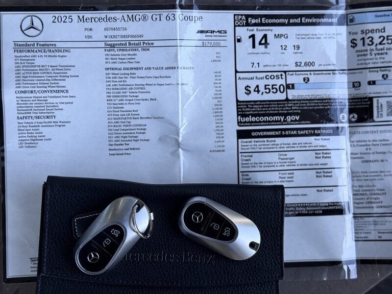 2025 Mercedes Benz AMG GT63, Selenite Grey Metallic/Black Nappa Leather, AMG Carbon Fiber Trim, 21" AMG Forged Cross-Spoke Wheels, Fixed Panorama Roof, AMG Extended Night Package, 2 Keys with Books, 1 Owner, Clean Title, Clean Carfax, Original MSRP $199,840